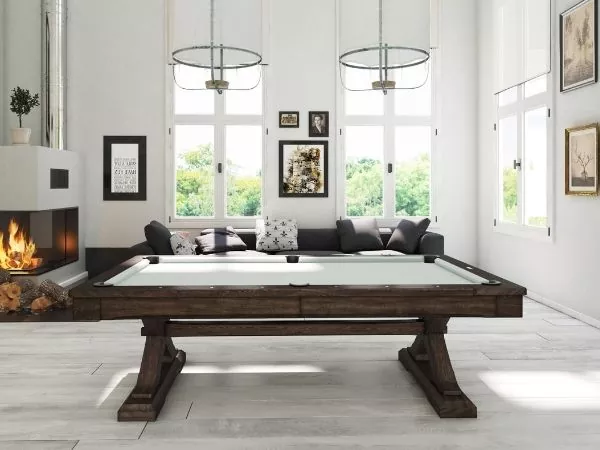 The weathered Kariba dining pool table is a solid wood pool table with a dining tabletop option. This stylish transitional design is finished with an in-vogue charcoal brown finish. The dining top helps convert the table form playtime to dinner time within minutes. The Kariba dining billiard table is perfect for those who might be limited in space.